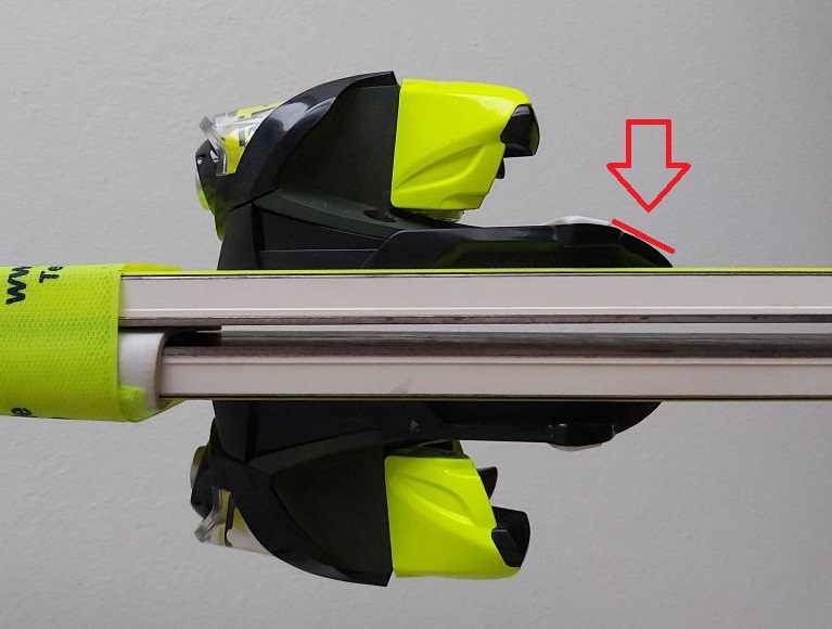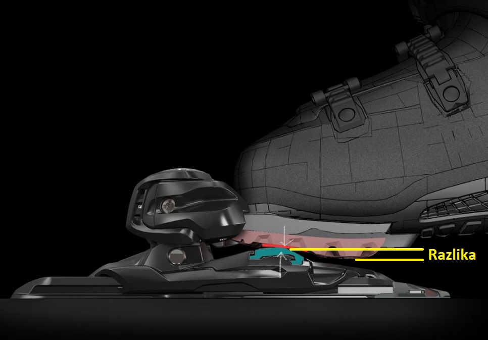 Prvo, težina skijaša će na prednji vez biti prenijeta preko isturenog gumenog dijela đona ("Razlika" na prvoj slici) na nepokretni dio veza iza AFD klizne/pokretne pločice (žuti krug na drugoj slici). U prevodu: pancerica će biti fiksirana (zalijepljena gumom) za vez i u slučaju pada tj. potrebe da prednji vez izbaci, to se neće desiti jer o otvaranju više ne odlučuje samo vez, već i frikcija (zalijepljenost) đona za fiksni dio veza.