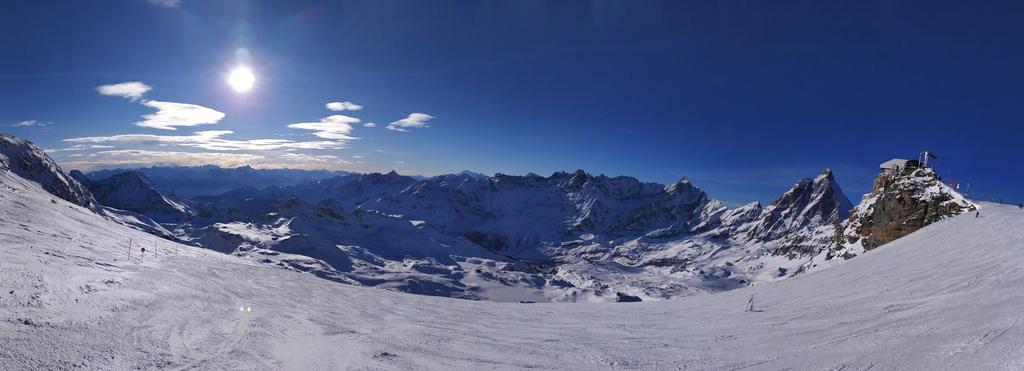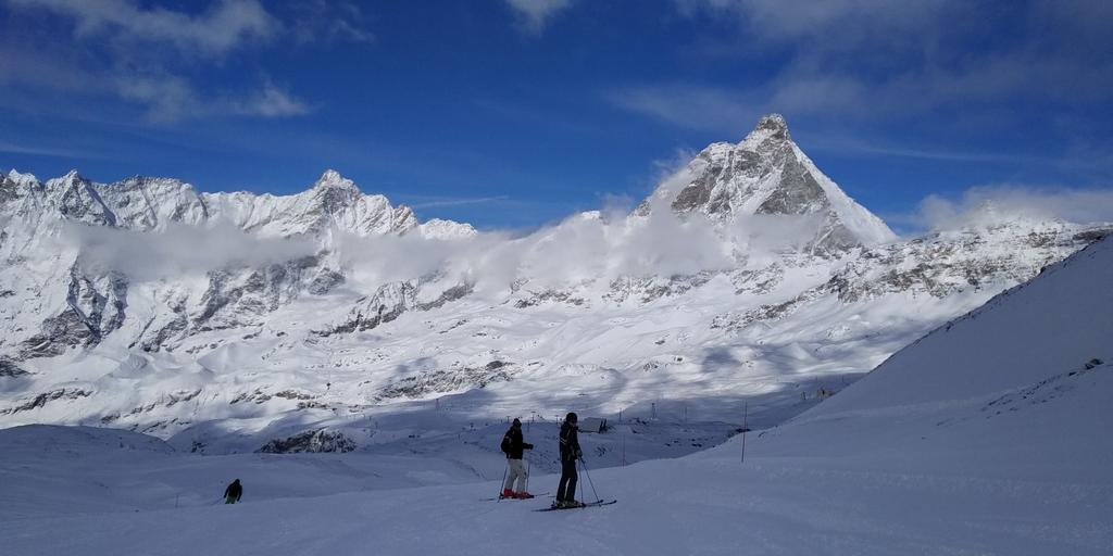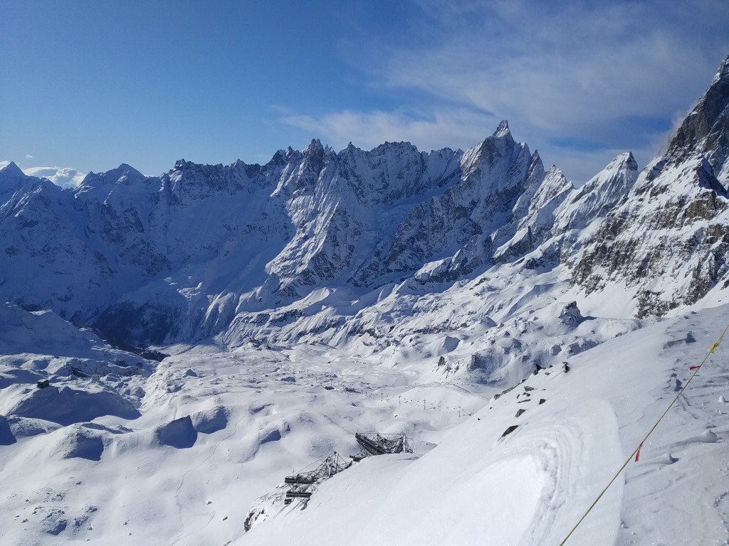 Dan 4 – 7 Valtournenche/Cervinio/Zermatt. Kao što je Danijel, mladić koji je bio nadležan za naš smeštaj, inače žičničar u Cerviniji i predvideo, u većini slučajeva nakon tri vetrovita dana nastupio je duži period stabilnog vremena, pa smo konačno ostatak perioda skijali u lokalu Valtournenche/Cervinio/Zermatt. Gondola iz Valtournencha(1524 mnv) izvlači na 2245 mnv, odakle se sa još tri vezane sedežnice penje na vrh ovog dela skijališta odakle se kombinacijom staza raznih kategorija može spustiti do samog mesta. Pri tome staza br. 1. koja ide do mesta nije ni poveznica niti ski put niti bilo šta slično, već ozbiljna na momente vrlo zahtevna pista koja omogućava uživanje u spuštanju celom svojom dužinom. Ali ako ste smešteni u mestu Valtournenche a vraćate se krajem dana iz švjcarskog dela skijališta sa vrha Mali Matehorn koji se nalazi na 3880 mnv, kako je bilo u našem slučaju, bićete u mogućnosti da se odatle spustite do mesta što sa razlikom u nadmorskoj visini većom od 2300 mnv i dužinom staze od preko 15 km, predstavlja nešto što se pamti celog života. Pored opisane staze u ovom delu skijališta ima još nekoliko staza srednje kategorije koje se međusobno prepliću i ukrštaju međusobno kao i pristojan broj staza za skijaše koji se tek odlučuju na prve korake na skijama. Mi smo ovaj deo skijališta koristili uglavnom kao vezu ka Cerviniji i Švajcarskoj s’obzirom na startni manjak vremena predviđenog za ovu lokaciju. Sa vrha novootvorene sedežnice Gran Sometta 3165 mnv koja predstavlja i veznu žicu za skijalište Cervinio, nekoliko pristojnih staza srednje kategorije vodi do platoa Plan Maison 2555 mnv centralne raskrsnice skijališta Cervinia, odakle sistemom tri vezane sedežnice možete doći do prevoja po nazivu Theodolpass 3381 mnv odakle se može preći na švajcarsku stranu skijališta ili sa nje vratiti u Italiju, a može se i spustiti da samog mesta Cervinio. Ova staza je srednje kategorije, dugačka i najopterećenija u skijalištu, a samim tim mnogo ranije podložna pogoršanju kvaliteta i otežanim uslovima skijanja. Ipak zbog svoje ne prevelike zahtevnosti ne predstavlja problem koristiti je i kao zadnju žicu za povratak u mesto na kraju dana. Paralelno sa njom, uz samo podnožje planinskog štita Matehorna i okolnih vrhova, prostiru se još dve vezane sedežnice sa stazama kombinovane kategorije manje opterećonisti i dužine a lepšeg ugođaja skijanja. Sa platoa Plan Maison vodi i sistem dve gondole koja vas može izvući do vrha Cervinie na granični prevoj Plato Rosa 3480 mnv odakle se ne možete vratiti na polaznu tačku već direktno do samog mesta što uslovljava korišćenje gondole za izvlačenje iz samog mesta koja je često nešto opterećenija. Plato Rosa 3480 ujedno je i drugo mesto za prelaz između skijališta sa Švajcarske i Italijanske strane. Vizuelno, skijalište sa italijanske strane predstavlja široku padinu sa čijeg se vrha, koji ujedno predstavlja i granicu dve zemlje, u nekoliko pravaca staze slivaju ka mestima Valtounenche i Cervinio. Skijalište iznas Cervinie je veće i znatno opterećenije od onog iznad Valtournoncha koje ima jednu ali vanserijsku dinamičnu pistu ali i nekoliko drugih sasvim pristojnih na kojima se može relaksiranije uživati. Koncept našeg skijanja bio je da odmah idemo na Švajcarsku stranu, zbog znatno veće razuđenosti ovog skijališta, većeg izbora kvalitetnijih staza, lepšeg vizuelnog doživljaja i mogućnosti nepredviđenih zatvaranja prelaza usled vremenskih neprilika, a onda u povratku skijamo Cerviniu i Valtournenche. Utiske o skijanju iz Zermata možete pročitati na istoimenoj temi u okviru skijališta Švajcarske.