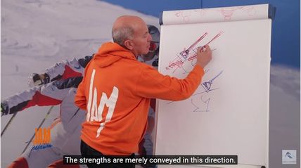 za koju ti kazes da opterecuje bocnu ivicu, dok je crvena sila ova kojom mi opterecujemo skiju odozgo. Stvar je u tome da se ni jedna od njih ne moze gledati zasebno jer deluju zajedno na istu tacku, a to je vrh ostrice ruba. Kao sto vidis, rezultujuca (ljubicasta) sila deluje u nekom pravcu koji je blizu vertikalnom i ona je zasluzna za usecanje ruba u led.