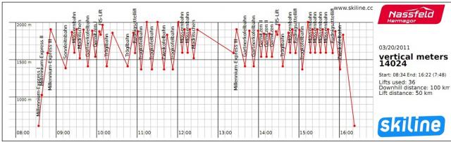 Subota oblačno, bez magle. Vidljivost 2-3 km. Na parkingu nas je obradovala situacija sa brojem automobila (do 50) i 6 turističkih autobusa. Ko je bio na Nasfeldu, zna da je to pesma. Na stazama je bilo par situacija da bukvalno nikoga ne sretnem od vrha do dna. Tome je kumovala pre svega temperatura od -22c i na to dodati vetar od 15-20 kmh.