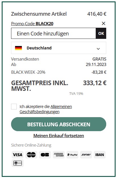 Prilikom obrade narudžbe trebaš unijeti kod "Black20" u polje "Einen Code hinzufügen" da bi dobio još 20% popusta na ovu cijenu od 416,40€ i ukupna cijena (uključuje i isporuku unutar DE) je 333,12€. Ovako izgleda forma nakon unosa tog koda: