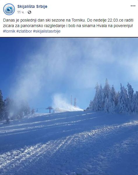 Situacija na Torniku je: "Not great, not terrible!". Kako kapiram, do sada su koristili priliku da prave veštak kad god su mogli pa ga po potrebi raspoređuju po stazama. Na web kameri se vidi da pokušavaju da osposobe i Zmajevac, ali još nije pušten i ja lično sumnjam da će ovih dana jer vidim da će temperatura biti u plusu. Sve ostale staze rade ( Tornik, Čigota i Stankova ravan) tako da nije baš katastrofa. Ako za vikend bude najavljeno toplo vreme, a počinje i raspust i to je gužva u najavi, onda je za očekivati da ujutru bude ok a posle 11h već standardno razvaljena staza.