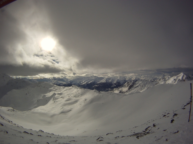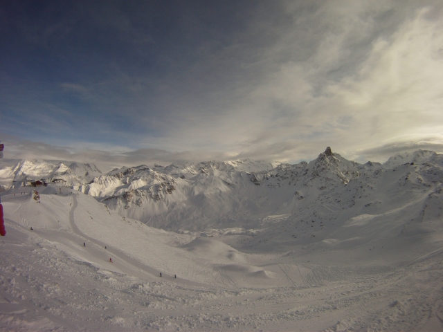 Evo ja prebacih odgovor ovde zato što smo jutros prešli na ovu stranu.. Danas dan sunčan, lep i vedar tako da je bilo mnogo lepše skijati van staze - neke staze (od Meribela do desne doline/Menuira) uopšte nisu ni sređivane tako da je sve bilo offpiste (zatvorili staze ali tragovi na sve strane). Takođe i padine na levu stranu (kada se krene za Kurševel) dušu dalo za van - nije mi trebao nikakav vodič ;) (staza ide kao zmija pa samo idem pravo dole). Evo i slike sa te strane (vidik):