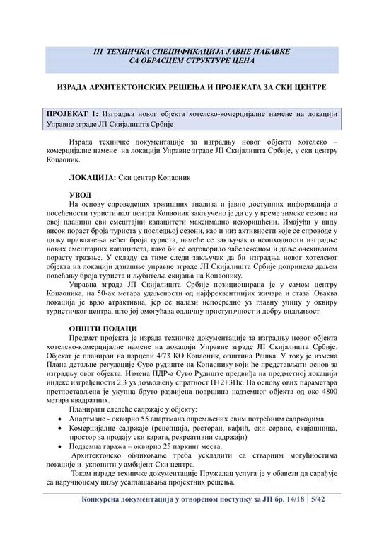 Ski centar Kopaonik, kao i sam turistički centar, poslednjih godina širi svoje kapacitete, pa je samim tim i broj posetilaca značajno povećan. Ski centar Kopaonik poseduje instalacije vertikalnog transporta koje svojim kapacitetom premašuju kapacitete ski staza. Kako bi se povećao konfor korisnika, rasteretile postojeće staze, a samim tim poboljšala funkcionalnost i bezbednost u skijalištu, planira se uređenje terena i izgradnja novih ski staza, i u tom smislu je raspisana Javna nabavka.