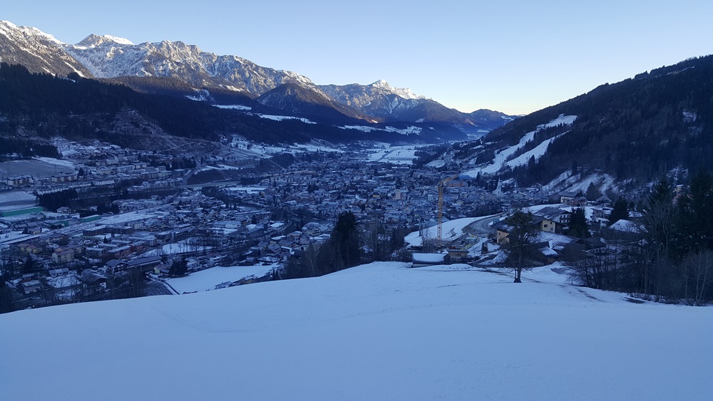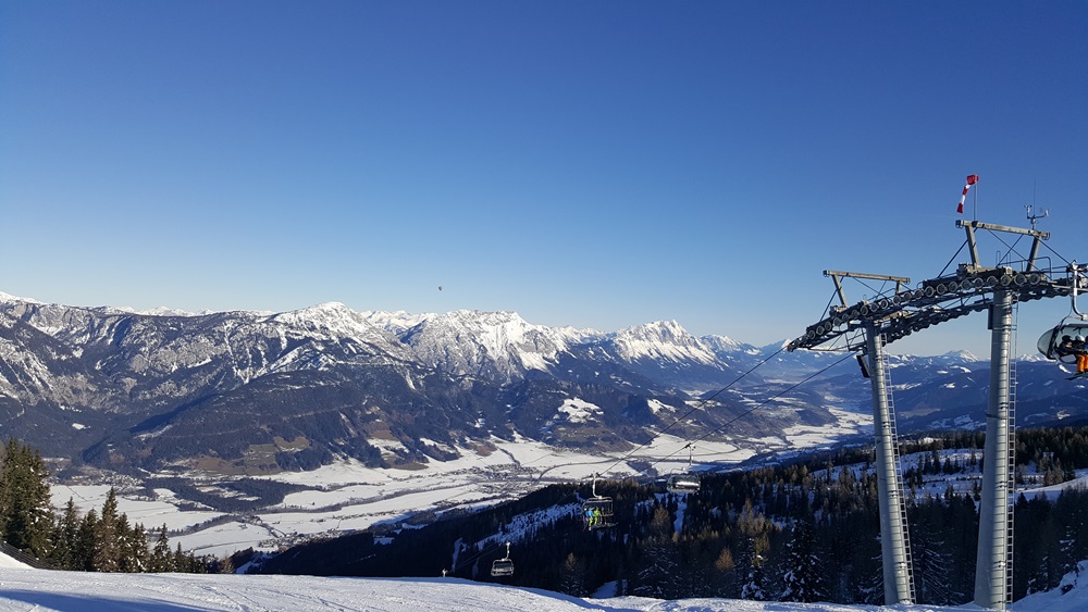 Mi smo odlučili da prvi dan skijamo dio Planai Hauser, tako da smo već u 8 i 20 bili na podnožju gondole Planai west gdje smo kupili ski pas ( 3 dana 153€ ski Amade čitav). Na slici je pogled na Šladming sa crvene 31 staze u podnožju Hochwurtzen-a.Prilog 16403