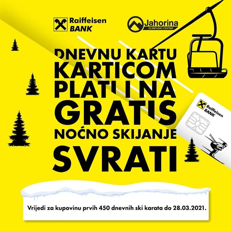 "Plaćajte Raiffeisen debitnim i kreditnim karticama na Raiffeisen POS terminalima svakog vikenda u našem ski centru i uz kupovinu dnevne ski karte po jedinstvenoj cijeni od 40 KM dobijate gratis noćnu ski kartu za isti dan!"