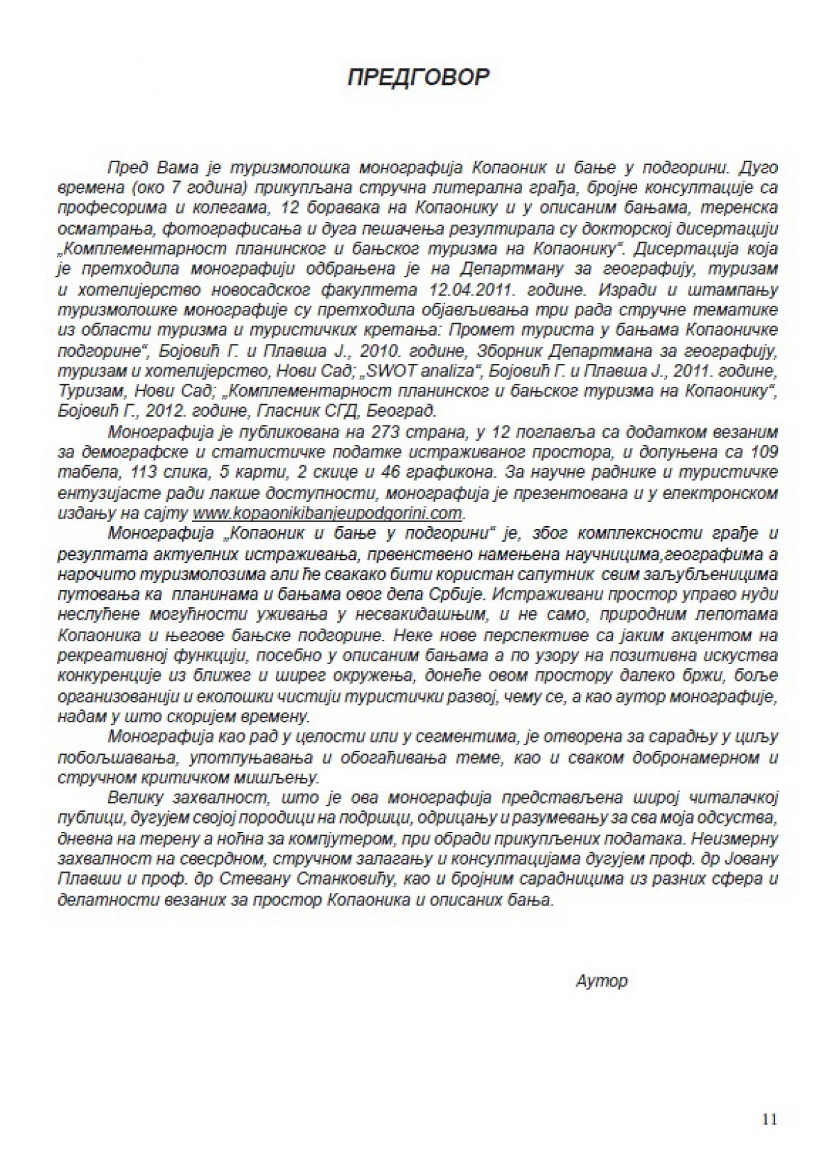Monografija „Kopaonik i banje u podgorini“ je, zbog kompleksnosti građe i rezultata aktuelnih istraživanja, prvenstveno namenjena naučnicima, geografima a naročito turizmolozima ali će svakako biti koristan saputnik svim zaljubljenicima putovanja ka planinama i banjama ovog dela Srbije. Istraživani prostor upravo nudi neslućene mogućnosti uživanja u nesvakidašnjim, i ne samo, prirodnim lepotama Kopaonika i njegove banjske podgorine. Neke nove perspektive sa jakim akcentom na rekreativnoj funkciji, posebno u opisanim banjama a po uzoru na pozitivna iskustva konkurencije iz bližeg i šireg okruženja, doneće ovom prostoru daleko brži, bolje organizovaniji i ekološki čistiji turistički razvoj, nadajmo se u što skorijem vremenu.