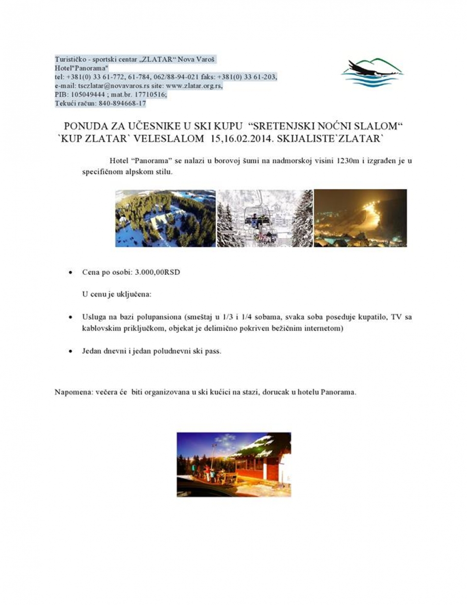 Za praznik Sretenje 15.02.2014. najavljeno je održavanje Ski kupa "Sretenjski noćni slalom", a dan kasnije 16.02.2014. Kup "Zlatar" u veleslalomu. Smeštaj po povoljnim cenema obezbeđenu Hotelu "Panorama".