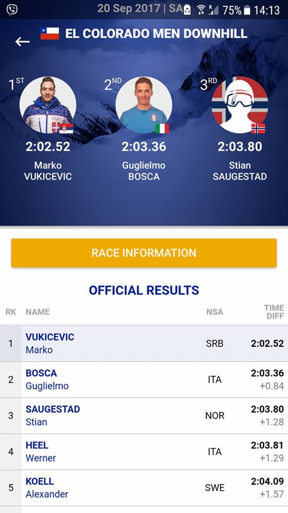 Reprezentativac Srbije u alpskom skijanju Marko Vukićevuić je postigao najbolje vreme na dve trke u disciplini spust koje su 20 i 21. seprembra 2017. vožene u ÄŒileu, u ski centru El Colorado u okviru FIS SAC (South American Cup) - JužnoameriÄkog kupa.