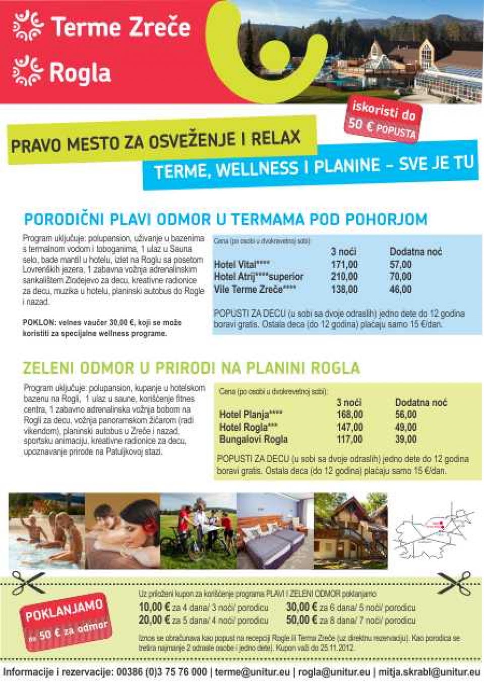 Rezervacije: 00386 (0) 3 75 76 000, 147, 157, 145, rogla@unitur.eu, terme@unitur.eu